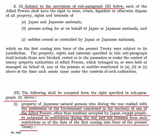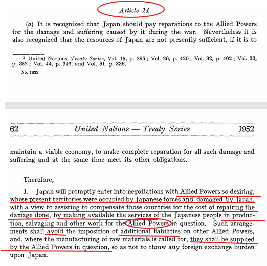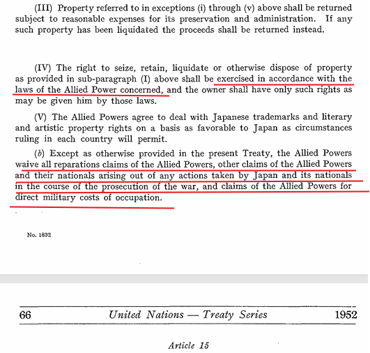 虽然旧金山合约第14(b)条包括盟国豁免日方战争赔偿的条款,但是中华人民共和国并非盟国,签约人并不包括中华人民共和国。旧金山合约的第14(a)条赔偿条款另外还包括日方出工出人帮助受害人修复战损财产的义务以及中华民国依据中华民国法律没收旧金山合约规定范围的日方在华财产的权利,但是中国共产党把旧金山合约规定范围的日方在华财产通过解放战争、社会主义改造公有化等方式已经私吞,完全不符合旧金山合约,中共也应对此承担法律责任。