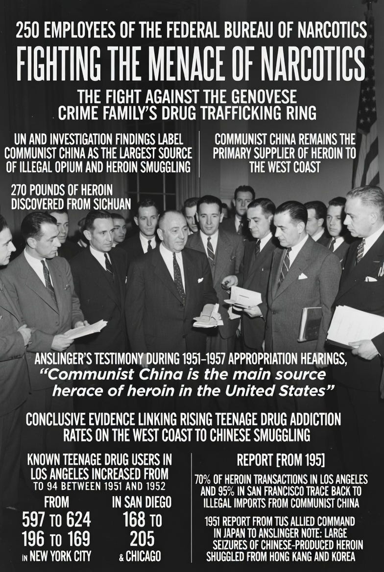 美国联邦麻醉品局局长和驻联合国麻醉品委员会代表安斯林格在国内是不折不扣的禁毒斗士...,在1950年和1951年联合国麻醉品委员会的两次大会上攻击新中国“通过日本向美国非法出口海洛因等毒品”,要求中国采取措施关闭所谓“海洛因工厂”。(这里的新中国明显是毒品犯罪组织中国共产党成立的犯罪工具“中华人民共和国”,下同)