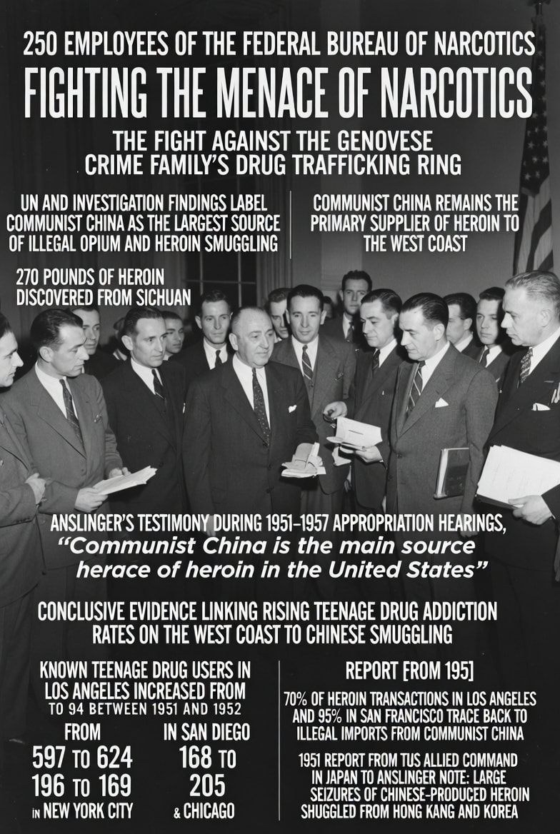 在1951年至1957年的拨款听证会上,他都在委员会的议员面前攻击中国是美国境内海洛因的主要来源。华盛顿,11月23日——参议院听证会今日获悉,有“确凿证据”表明,从共产主义中国走私的海洛因是导致西海岸青少年吸毒成瘾率上升的原因。他表示,他掌握的其他数据显示,洛杉矶70%的海洛因交易和旧金山95%的海洛因交易可以直接追溯到来自共产主义中国的非法进口。