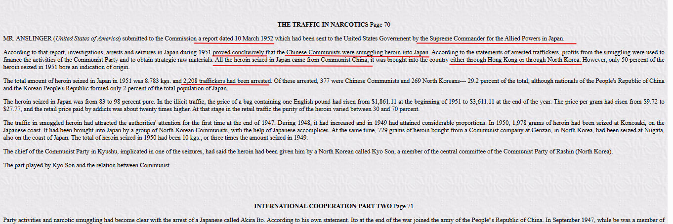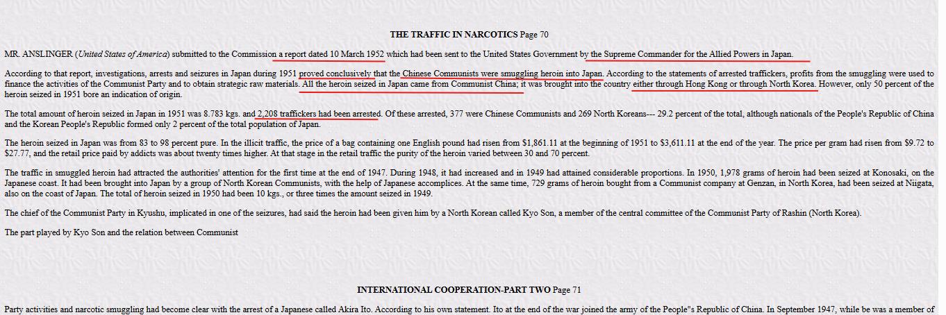 1952年3月10日,美国驻日盟军总司令部向安斯林格递交报告,声称:“1951年,日本查获大量从中国香港和朝鲜方向走私来的中国产海洛因”。