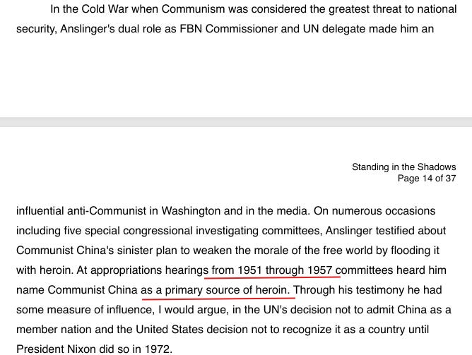 在1951–1957年的美国国会听证会上,美国联邦麻醉品局局长哈里·安斯林格(Harry J. Anslinger)多次公开指责“共产党中国”是海洛因走私的主要来源,并在听证会面前反复提出类似说法: