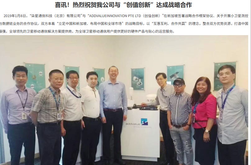 In early January 2019, 7Star Communications Technology (Beijing) Co., Ltd.(a/k/a Seven Star Communication Technology (Beijing) Co., Ltd.) signed a strategic cooperation framework agreement with Addvalue Innovation Pte Ltd, a 100% subsidiary of ADDVALUE TECHNOLOGIES LTD (Singapore). The agreement covers collaboration in small satellite control and data link operations and reflects a broader vision of integrating the companies’ technological capabilities across China, Singapore, and global markets.