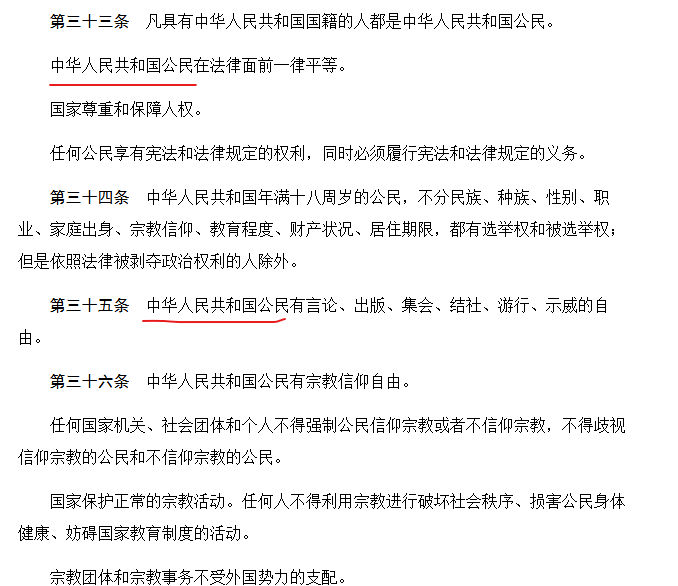 “中华人民共和国公民有言论、出版、集会、结社、游行、示威的自由。”